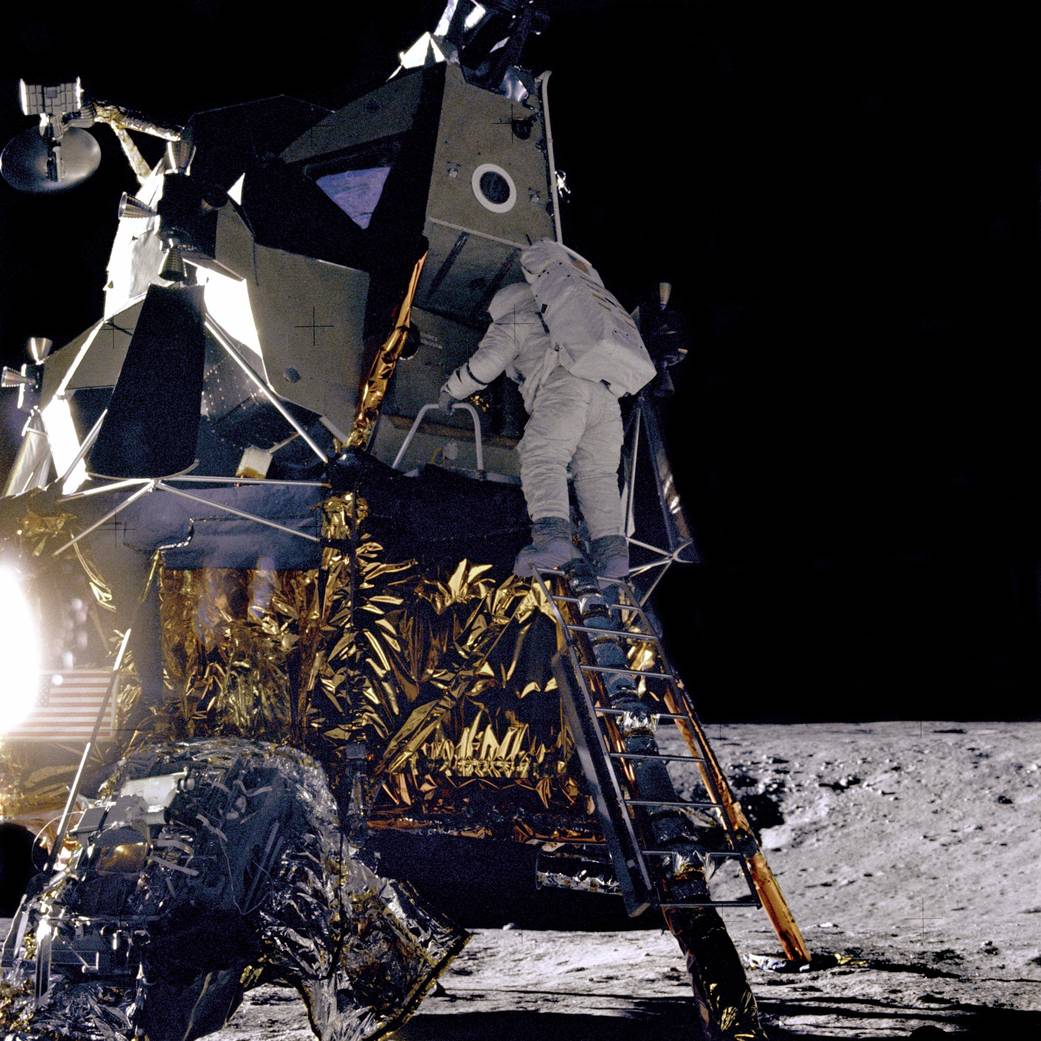 primo a scendere la scaletta. Nella loro prima esplorazione lunare,